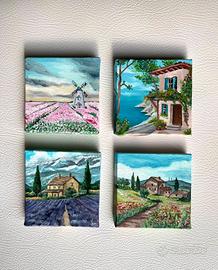Set quattro quadri, olio su tela, misura 7x7 cm con cavalletto incluso. Fatti a mano.