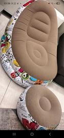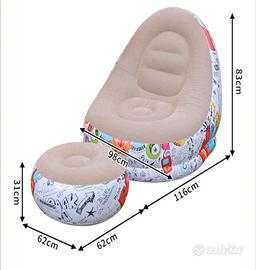 Vendo set relax gonfiabile composto da una comoda poltrona ergonomica e un pouf poggiapiedi coordinato. Il design è moderno e vivace, caratterizzato da una divertente stampa in stile "graffiti/pop art" sui lati e una morbida seduta floccata in tonalità beige per il massimo comfort.