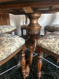 Vendo coordinato per sala da pranzo in stile classico, composto da un tavolo tondo con colonna centrale e 5 sedie imbottite. Un set solido e di grande eleganza, ideale per chi cerca mobili di qualità costruttiva superiore.