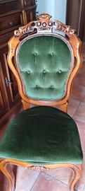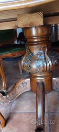 Vendo raffinato set da sala da pranzo composto da tavolo tondo e 6 sedie coordinate. Il tavolo è realizzato in legno con eleganti lavorazioni a intarsio sul piano. Il diametro è di 120 cm e da aperto raggiunge 163 cm, per ospitare 8/10 persone. Le 6 sedie sono imbottite e rivestite in velluto color verde bosco, con struttura solida in legno. Ottime condizioni, tenuto con estrema cura