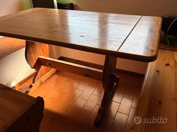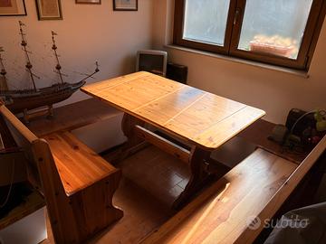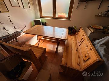 Vendesi splendido set completo da pranzo in vero legno massello, perfetto per arredare con calore una taverna, una casa in montagna o una sala da pranzo in stile rustico/country. I mobili sono robusti, ben conservati e caratterizzati dalle venature naturali del legno che donano carattere a ogni ambiente.