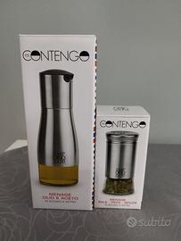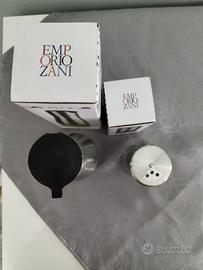 Elegante set olio/aceto e sale/pepe/spezie. In acciaio e vetro. Nuovo, mai utilizzato. Marca Emporio Zani.