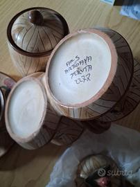 set saliera e tegame terracotta e piatto decorato mano. anni 70/80.