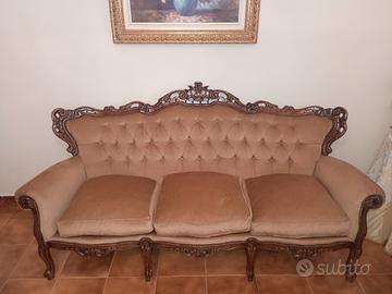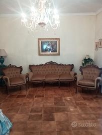 Vendesi prestigioso coordinato da salotto in stile classico/barocco, perfetto per chi desidera arredare con eleganza, calore e un tocco di lusso d'altri tempi. Il set è realizzato con una struttura in legno massiccio finemente intagliato a mano e rivestito in un pregiato velluto color oro/bronzo che dona riflessi luminosi e una morbidezza incredibile al tatto. La lavorazione capitonnè sullo schienale sottolinea l'artigianalità del prodotto. Il set è composto da 3 pezzi in ottime condizioni: 1 Divano a 3 posti: (Misure: L 196 cm x P 88 cm x H 101 cm) 2 Poltroncine singole: (Misure: L 90 cm x P 86 cm x H 88 cm) Caratteristiche: Imbottiture integre e confortevoli. Struttura solida e priva di difetti. Ideale per saloni di rappresentanza, studi professionali o case d'epoca. Prezzo: € 1.500 Stato: Usato in ottime condizioni. Ritiro a carico dell'acquirente (o specifica se offri trasporto). Disponibile per essere visionato di persona previo appuntamento.