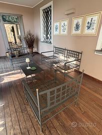 Meraviglioso salotto da esterno della nota casa Unopiù comprendente: 2 poltrone in ferro, un divano in ferro e relativo tavolino, tutto compreso di cuscineria vendo a metà prezzo Eur 2.200. Trasporto a carico dell’acquirente Astebersi perditempo