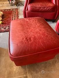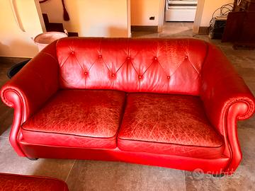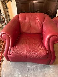 Realizzati in vera pelle rossa, questi arredi dallo stile classico e raffinato presentano linee morbide con braccioli arrotondati e lavorazione capitonné sullo schienale. La pelle è in buono stato generale, con segni naturali di usura che donano carattere e fascino vintage al set.