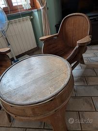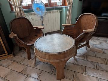 il set comprende due poltroncine ed un tavolino da salotto in legno massello di noce lavorati in stile botte, datati all' incirca nel 1970.