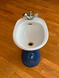 Set sanitari Bagno Richard Ginori serie Gardena Antonia anni '70, in ceramica blu. In buone condizioni, manca la colonna del lavandino, i rubinetti e i manici presentano qualche segno di calcare come le tubature.