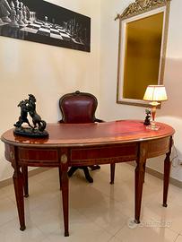 Per amanti del gusto classico e dell’antiquariato di qualità, propongo un esclusivo set da ufficio coordinato. I mobili presentano una splendida impiallacciatura in essenze pregiate con eleganti inserti in bronzo dorato.