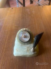 Elegante oggetto da scrivania vintage in Onice Verde naturale, pezzo autentico dell'artigianato toscano. Come visibile in foto, la base conserva l'etichetta originale "La Versilia - Onice e Marmi - Forte dei Marmi", garanzia di qualità e provenienza da uno dei laboratori storici della zona. Il set comprende un termometro analogico incastonato e un supporto portapenna basculante in ottone. La pietra presenta le caratteristiche venature "a nuvola" tipiche dell'onice di alta qualità, con bellissimi giochi di trasparenza. Epoca: Anni '60 circa. Condizioni: Ottime, pietra integra e senza scheggiature. Etichetta originale ancora presente sul fondo. Un pezzo di design Mid-Century perfetto per un ufficio di classe o come regalo per collezionisti.