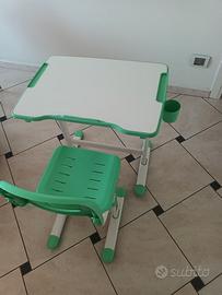 E' composto dalla sedia regolabile in altezza e dal tavolo regolabile in inclinazione e altezza, non ci sono angoli taglienti pertanto il bambino può evitare possibili lesioni.