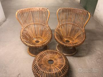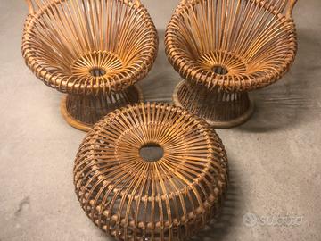 Il tutto in Antico e pregiato Vimini, tutto il set è corredato di cuscini in gommapiuma rivestiti da stoffa originali, lo stato attuale (vedi foto) sono conservate in originale dagli anni '50 ad oggi quindi presentano normali segno di utilizzo.