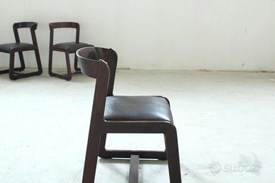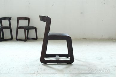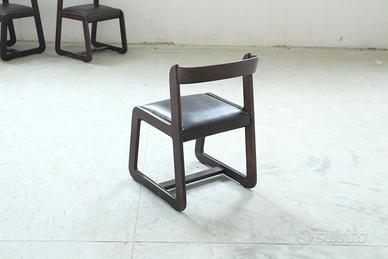 Quattro sedie ideate da Willy Rizzo e Mario Sabot, in legno e pelle, degli anni 1970. Dimensioni: Larghezza 47 cm Profondità 52 cm Altezza 74 cm Questo prodotto è in esposizione e disponibile al ritiro: presso lo showroom 39Vantini Oldstyle, via Rodoldo Vantini 39, 25126 Brescia