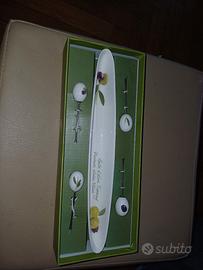 Set di servizio per aperitivi a base di olive composto da piatto in ceramica e forchette in metallo.
