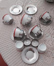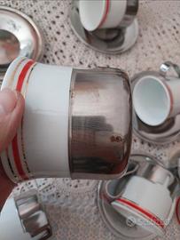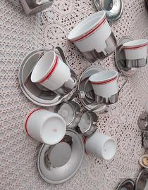 Servizio da Caffè espresso vintage fine anni 60's Inzio 70's In porcellana bianca , decoro rosso e applicazioni del filo oro ✔️ Ciascuna Tazzina ha supporto e piattino in acciaio inossidabile✔️ INOXRIV - Marchiato sotto ✔️ Composto da 6 Tazzine + Supporto + 6 Piattini in acciaio 1 Zuccheriera abbinata con supporto in acciaio. ⚠️ Preciso che l'interno dell' supporto di quest' ultima ha un lieve puntino fi ruggine... dovuto alla lunga conversazione per il resto tutto ok. È stato conservato con cura dentro vetrina per moltissimi anni.. ⚠️Usato pochissimo Set composto da Tazzine