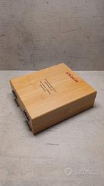 splendido cofanetto in legno - set servizio vini. mai utilizzato. composto da cavatappi, termometro, salvagoccia e tappo chiudi bottiglia.