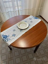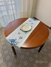 La credenza bassa, lunga 180 cm, profonda 41 cm e alta 83 cm, offre una grande capacità di carico con due ampi vani laterali e tre cassetti centrali da 90 cm, di cui l'ultimo più profondo. La vetrina a tre ante misura 135 cm di lunghezza per 149 cm di altezza e dispone di raffinati ripiani interni in vetro, perfetti per esporre servizi e cristalleria. Completa l'arredo un tavolo rotondo coordinato con un diametro di 120 cm e un'altezza di 74 cm, dotato di sistema allungabile per ospitare comodamente più persone.
