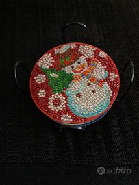 Set 6 Sottobicchieri Natalizi Fantasia: Pupazzi di Neve Ornamentati a Mano Stile: Diamond Painting fatti a mano Struttura in metallo per impilarli