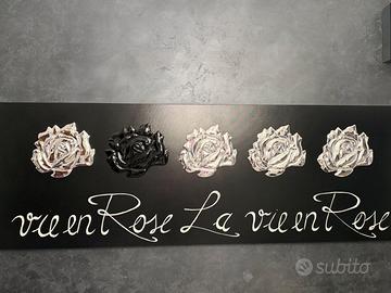 Bellissimo specchio rettangolare Pintdecor con cornice nera laccata opaca e decorazioni tridimensionali a forma di rose. Caratteristiche principali: • Cornice nera opaca di grande impatto, moderna e raffinata • 6 rose applicate a mano in rilievo: 4 nere opache e 2 argentate/cromate lucide (posizionate agli angoli per un effetto prezioso e contrastato) • Specchio di ottima qualità con riflesso nitido e pulito • Formato verticale rettangolare, perfetto per ingresso, camera da letto, soggiorno o sopra un comò • Stile glamour e contemporaneo, con un tocco dark-chic molto elegante Elegantissimo pannello da parete Pintdecor dal design romantico e glamour, perfetto per aggiungere un tocco di lusso e femminilità a qualsiasi ambiente. Dettagli principali: • Base nera laccata opaca di grande impatto visivo • 5 rose tridimensionali applicate a mano: 4 nere opache + 1 argentata/cromata lucida con bellissimi riflessi • Scritta centrale in corsivo bianco “vie en Rose La vie en Rose” (omaggio alla famosa canzone di Édith Piaf) • Effetto scultoreo e tridimensionale grazie alle rose in rilievo • Stile moderno, chic e raffinato – ideale per soggiorno, camera da letto, ingresso o sopra un mobile . Più due comodini abbinati
