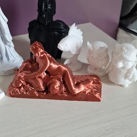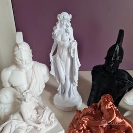 Collezione di stampe 3D realizzate in alta definizione. Il set include busti di guerrieri spartani (bianco e nero), una statua di divinità finemente dettagliata, riproduzioni di sculture classiche in bianco e bronzo/rame, e diverse miniature