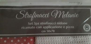 Set di tre strofinacci della linea Melanie di Preziosa Home. Presentano una fantasia a quadretti rossi e bianchi e pois rossi su fondo bianco, rifiniti con dettagli in pizzo e fiocchi decorativi. Dimensioni cm 50 x 70. Nuovi in confezione originale.