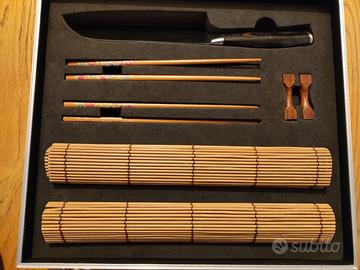 Set sushi per 2 persone, completo di valigetta, composto da: - 2 tovagliette - 2 paia bacchette (con portabacchette) - 2 piattini - coltello