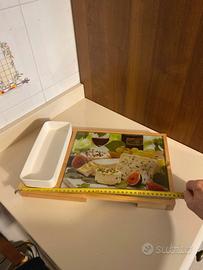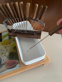 Elegante set da tagliere con pratiche forchettine. - Tagliere con stampa di formaggio e frutta. - Set di 6 forchettine con manico in legno.