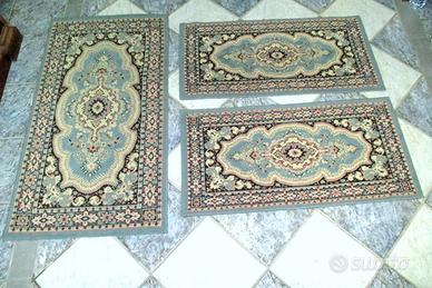 Bellissimo set di tappeti a intarsi simil persiani, composto da 3 pezzi. Utilizzabili come tappeti scendi letto, fantastici i giochi di colori vivaci e sfumati.