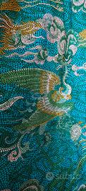 Set vintage anni "70 di tappezzeria realizzato con stoffa di Valentino, composto da 3 grandi tende a pacchetto (160 x 400 cm), una tenda composta da due grandi calate (150 x 200 cm), grande pouf quadrato (80 x 80 cm). la stoffa rappresenta splendidi dragoni orientali sui toni del verde e del blu. In omaggio con il set 2/4 cuscini realizzati con lo stesso tessuto.