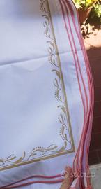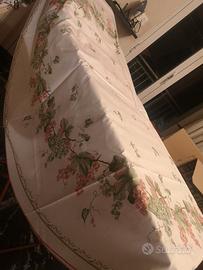 Splendido servizio da tavola completo per 12 persone, mai usato e in condizioni perfette. Il set è composto da una tovaglia grande e 12 tovaglioli coordinati. Materiale: 100% Cotone di alta qualità, fresco e resistente. Design: Elegante stampa con grappoli d'uva e foglie di vite nei toni del verde salvia e rosa antico, con delicato bordo dorato a motivi classici. Cade dritto sui lati e alle estremità rotondo. Dettagli: Orlo rifinito con cucitura rosa a contrasto e decorazioni in oro. Stato: Nuovo, mai utilizzato (ancora con le pieghe di confezionamento originali). Misure Tovaglia : 350 x 120 Misure Tovaglioli : 43 x 43