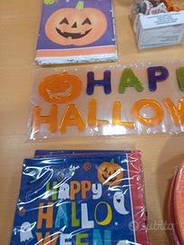 Set tavola Halloween. Set composto da: 40 piatti di carta (eco) diam. 23cm, 48 tovaglioli 33x33 cm, 1 tovaglia di carta cm 120x180, 16 bicchieri, 36 pirottini muffin/cup cake grandi, 400 pirottini piccoli, 1 scritta happy halloween in gel adesiva. Tutto nuovo in confezione originale.