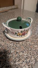 Formaggiera / Salsiera: Ciotola con coperchio e piattino integrato, dotata di scasso per il cucchiaino (utilizzabile anche come zuccheriera).