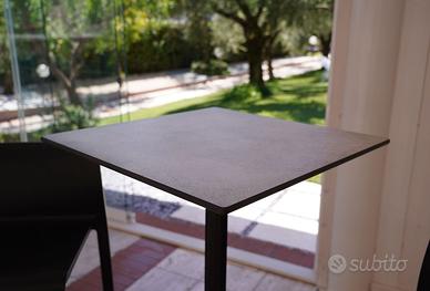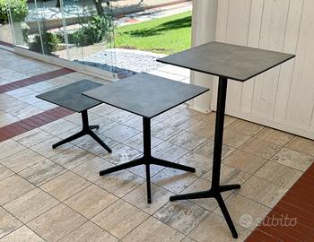 Tavoli in alluminio, colonna in estruso a tre razze in pressofusione, piano stratificato compact spessore 12 mm anima nera