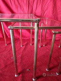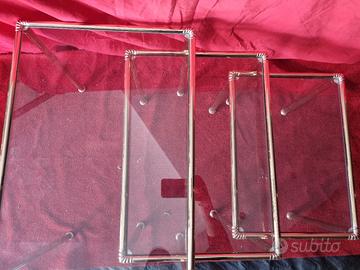Bellissimi 3 tavolini in vetro da salotto, set di 3 pratici e belli tavolini da salotto in metallo dorato e lavorato, impreziositi da piani in vetro.