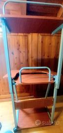 Tavolo computer color ciliegio con cassetto, piano estraibile e mensola regolabile in altezza, misure: profondità 58, larghezza 66, altezza 73 al piano, 132 alla mensola superiore che può essere abbassata.