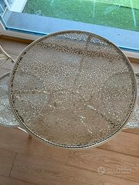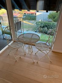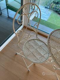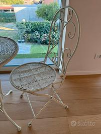 Set tavolino e sedie in ferro battuto verniciato bianco. Presenre tracce di ruggine