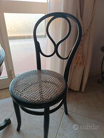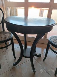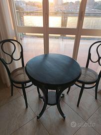 tavolino rotondo in legno ebanizzato, simile a un tavolino stile Art Déco, accompagnato da due sedie in stile bistrot con seduta in paglia di Vienna. Ottimo stato