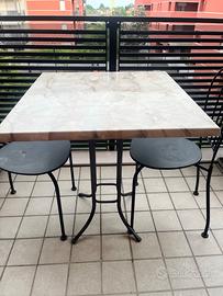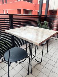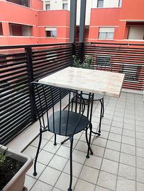Vendo set da esterno o interno composto da tavolo quadrato e due sedie coordinate, ideale per balcone, terrazzo o cucina. Il tavolo ha un piano robusto (non vola via con un colpo di vento) con un effetto marmorizzato nei toni del beige e crema, molto facile da pulire e resistente. La struttura del tavolo e le sedie sono in metallo nero dal design minimale. Dimensioni tavolo: 60x60 cm Stato: Ottime condizioni, solido e senza difetti evidenti. Stile: Moderno / Industrial / Bistrot. Consegna a mano a Padova province limitrofe. Non spedisco. Vendo per trasloco.