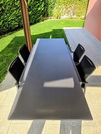 -Tavolo allungabile in vetro e alluminio, colore grigio antracite, 140-240 cm x 90cm -4 sedie con braccioli in tela e alluminio
