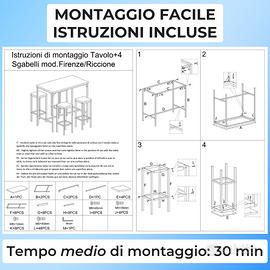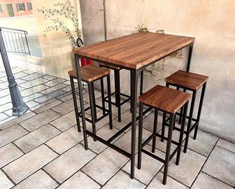 MATERIALE: Piani in pressato rivestiti di pvc colore legno simile Noce spessore 3 cm. Struttura tubolare 2,5x2,5 cm in metallo colore bronzo marrone scuro. Piedini in plastica. Utilizzo Domestico. Sono da interno. Portata tavolo 40 kg. Portata sgabello 100 kg.
