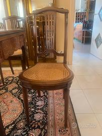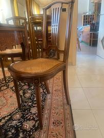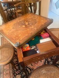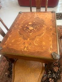 Tavolo da gioco francese intarsiato con applicazioni in bronzo con cassetto, fine 800, le sedie sono coeve al tavolo con paglia di Vienna, restaurate,