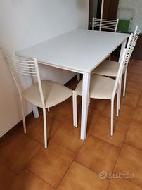 Set tavolo da soggiorno /cucina bianco +4 sedie color beige chiaro. Buono stato. Marca: mondoconvenienza Misure Tavolo: Lunghezza 110cm larghezza 70 cm Altezza 76 cm. Pezzi vendibili singolarmente. Solo tavolo 80€ Singola sedia 20€