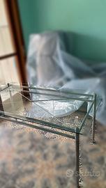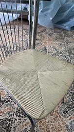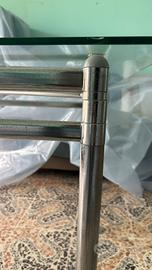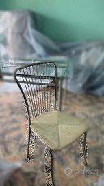 Tavolo di vetro in ottime condizioni il vetro, leggermente usurato dal tempo le parti metalliche. Sedie con pagliuzza perfetta (usate sempre con cuscini), parti metalliche usurate dal tempo come il tavolo.
