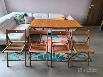 Usate ma ancora in buono stato e robuste, il tavolo misura 136x70 Come da ultima foto sia tavolo che sedie sono pieghevoli ed occupano pochissimo spazio.