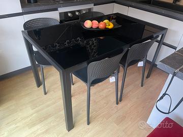 Set composto da un tavolo con struttura in metallo laccato e top in vetro + 4 sedie in polipropilene.