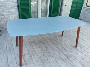 Tavolo con gambe affusolate e angolate in legno e piano sagomato in vetro opaco (di un colore che sembra grigio chiaro o azzurro pastello)