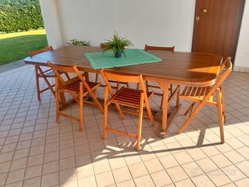 Tavolo da giardino in legno massello con sedie coordinate, trattato per terrazze, porticati e giardini. Dimensioni generose con 240 x 100 cm •Struttura solida e stabile con design elegante a listelli • Sistema modulare/allungabile che permette di adattare lo spazio in base agli ospiti Sedie pieghevoli coordinate e pratiche da riporre a fine stagione. Arredo che unisce qualità del legno, funzionalità e stile.