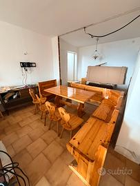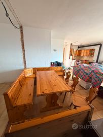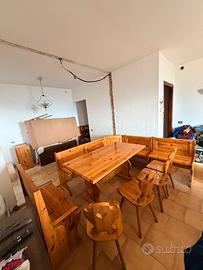 Vendo bellissimo set sala da pranzo rustico in vero legno massello, solido e pesante, perfetto per cucina, taverna, casa di montagna, agriturismo o B&B: crea subito un ambiente caldo, accogliente e tradizionale. Il set é composto da un gande tavolo, panca ad angolo, panca lineare e 4 sedie coordinate.