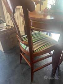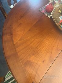 Vendo elegante set da pranzo in legno di ciliegio stile Neoclassico Tavolo rotondo diametro 110cm, allungabile con inserti originali. Dettagli dorati sul profilo e gambe a spillo lavorate. Sedie, 4 pezzi coordinate con schienale a medaglione e seduta imbottita