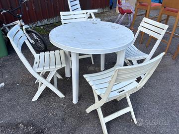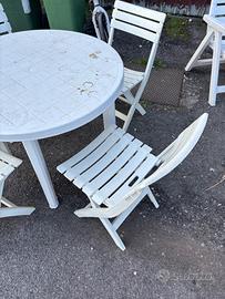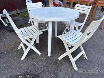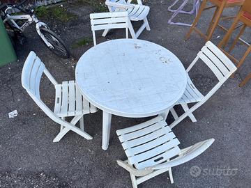 Set usate di tavolo rotondo e 4 sedie pieghevoli in plastica bianca, ideale per esterno, giardino, balcone o campeggio. Misure tavolo: diametro circa 90 cm, altezza circa 70 cm.